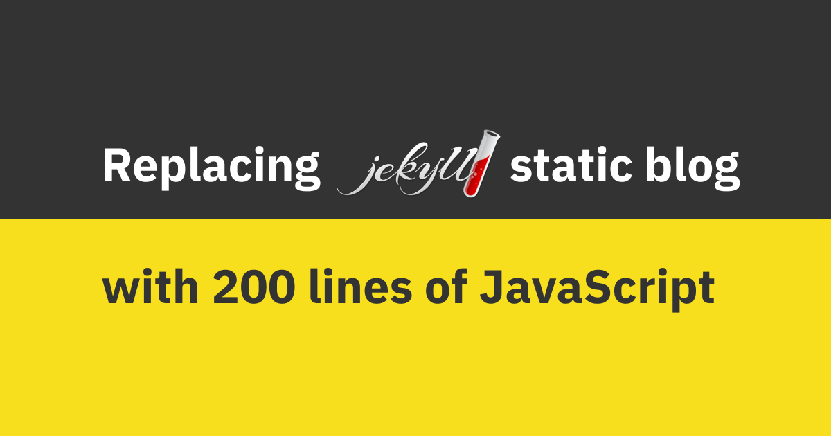 Sometime in 2021 I re-implemented parts of Jekyll I cared about in JavaScript in ~200 lines of code. It only needs NodeJS, all the dependencies are vendored-in (so there’s no package.json, yarn, npm, pnpn or whatever). It only uses JS syntax that’s been stable for years, so there’s no TypeScript or Babel needed.